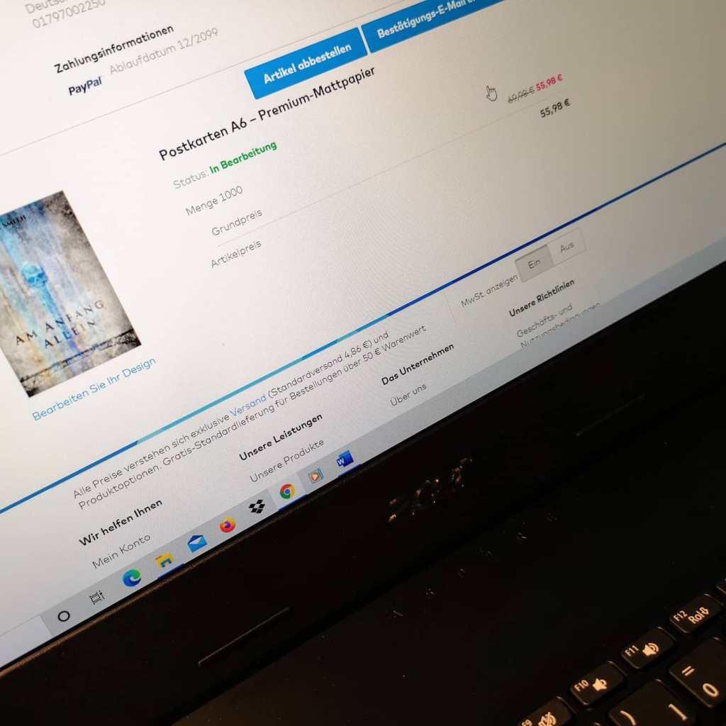 So ist das wohl, wenn man einem Traum folgt. Heute habe ich für die Crowdfunding-Kampagne die ersten Giveaways bestellt: Postkarten mit dem coolen Cover von Mark Huff. Ich freu mich tierisch darauf, die in den Händen zu halten.